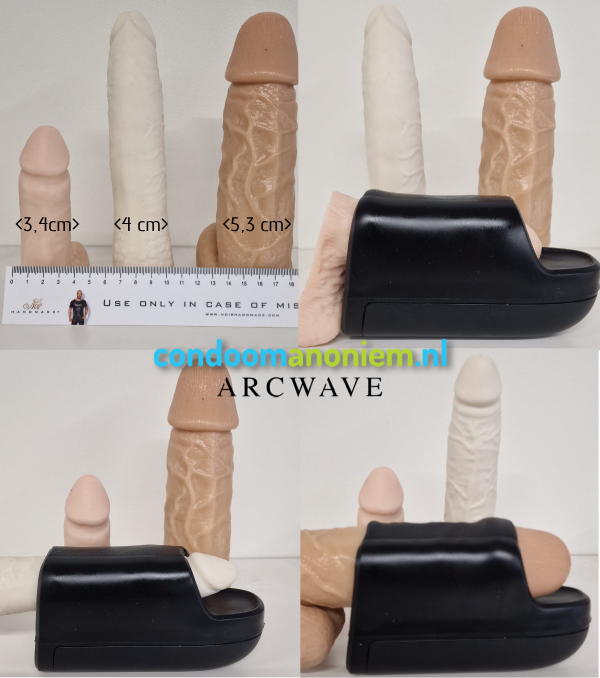 De productspecificaties geven de volgende maten op: ArcWave Ion lengte 15,4 cm, breedte 5 cm, hoogte 8,3 cm, binnenin Ø3,3 cm. Over de 'binnenin-maat' krijgen we regelmatig vragen. De ArcWave Ion is niet goedkoop, dus je wilt natuurlijk wel weten of het om de penis past! Het bovenste deel van de ArcWave, met de opening van Ø3,3 cm, waar de penis in gaat, is van zeer rekbaar maar stevig materiaal gemaakt. Op onderstaande afbeelding hebben we 3 verschillende penismodellen in de ArcWave op de foto gezet: