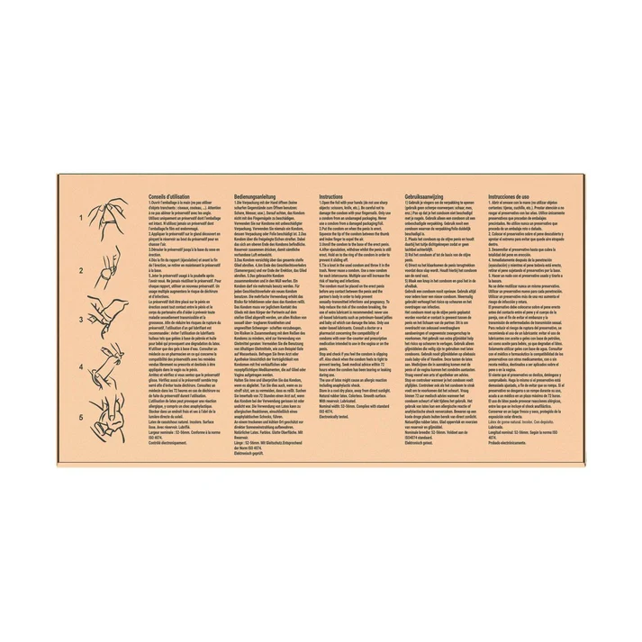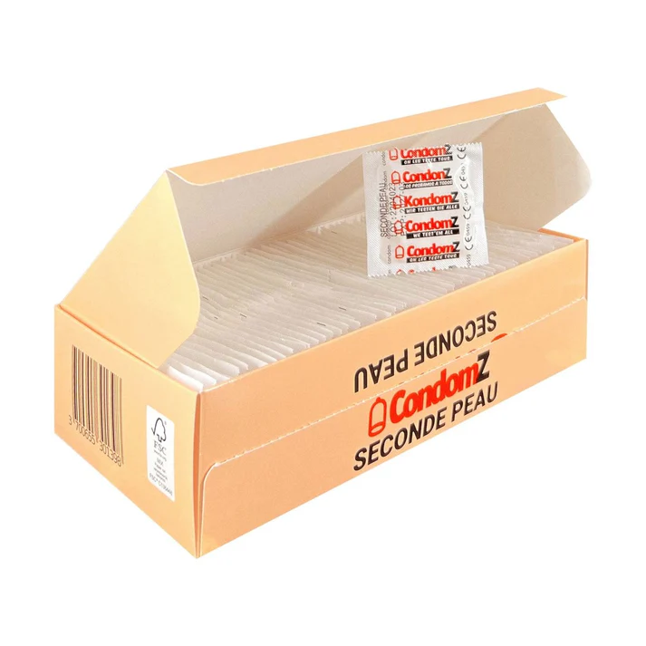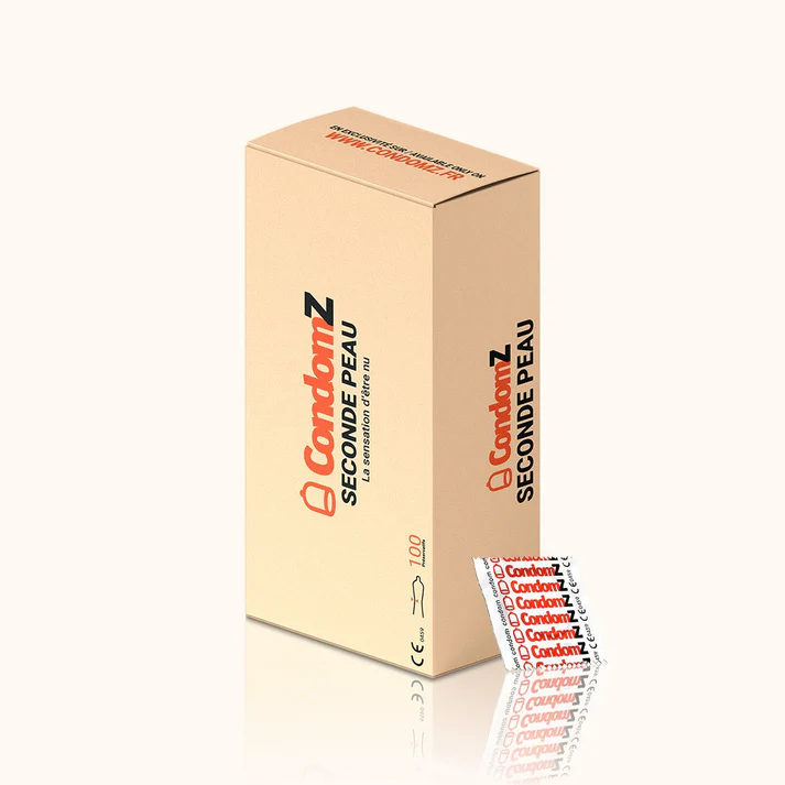 CondomZ Seconde Peau condooms zijn ultradunne condooms met glijmiddel en reservoir. Ze hebben een nominale breedte van 53mm met een anatomische vorm. Het dunne latex vormt zich als een tweede huid om te penis voor een optimaal en intiem gevoel. Condooms van het Franse merk CondomZ worden vervaardigd uit fair trade, vegan, natuurrubber latex en verpakt in een doos van gerecycled karton.