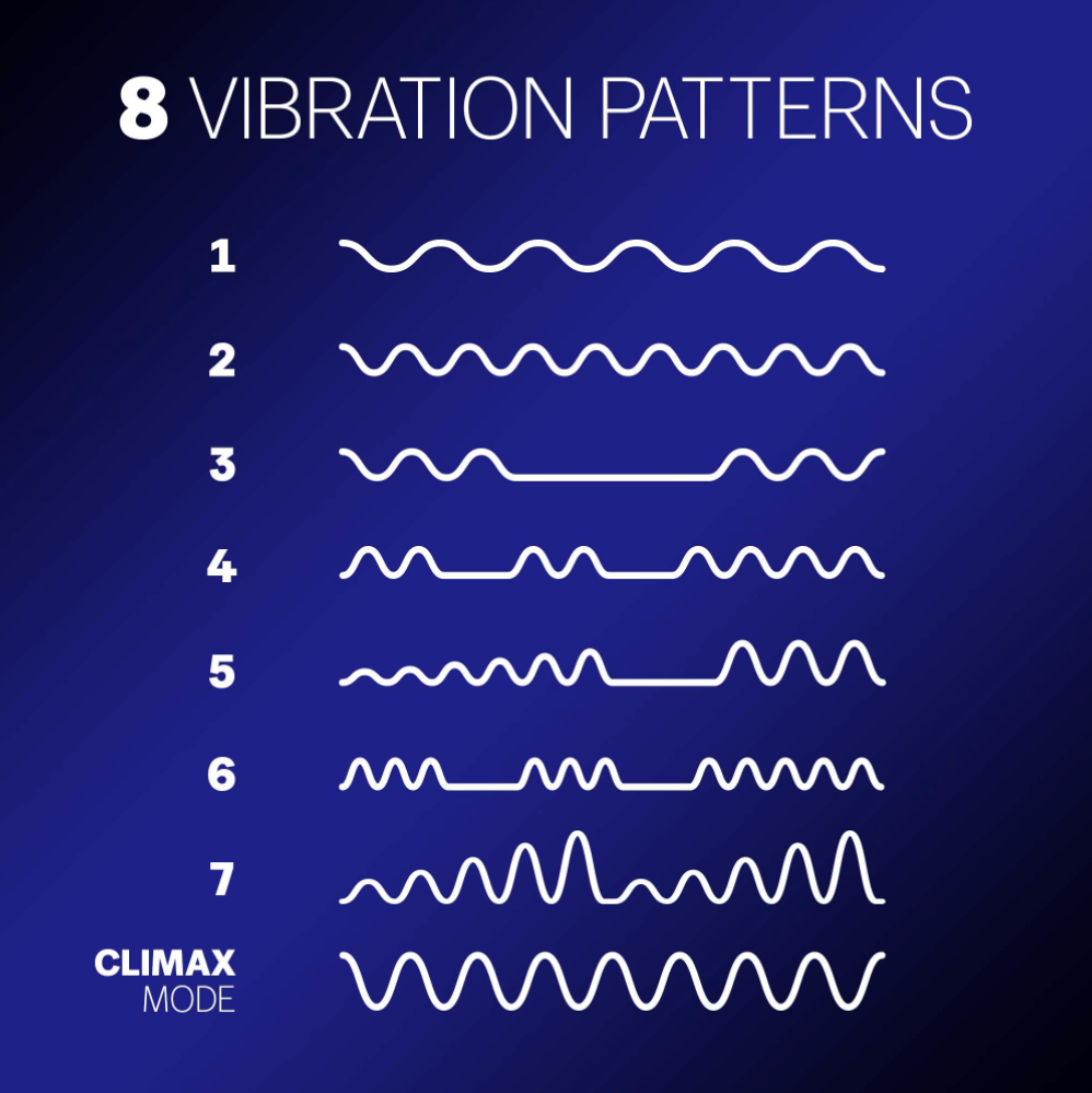 Houd de X-knop 3 seconden ingedrukt, het witte LED-lampje knippert. Om te schakelen tussen de 7 vibratie-intensiteiten druk je weer op de X-knop. Om uit te schakelen houd je het knopje weer 3 seconden ingedrukt.