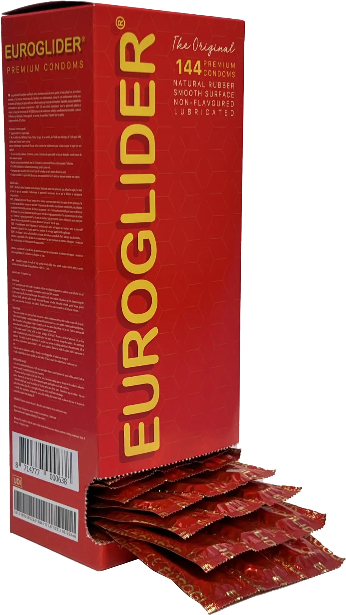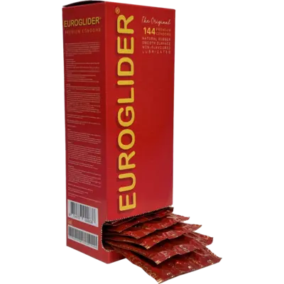 EuroGlider condooms zijn standaard transparante en gladde condooms met reservoir en glijmiddel, in een standaard maat. Deze grootverpakking bevat 144 Euroglider condooms vervaardigd uit natuurlijk rubberlatex.
