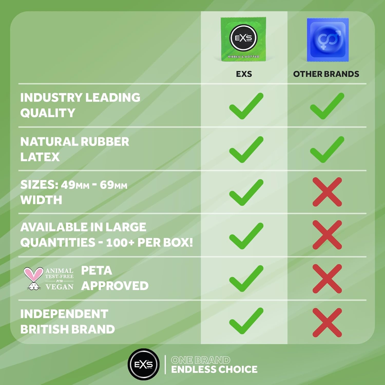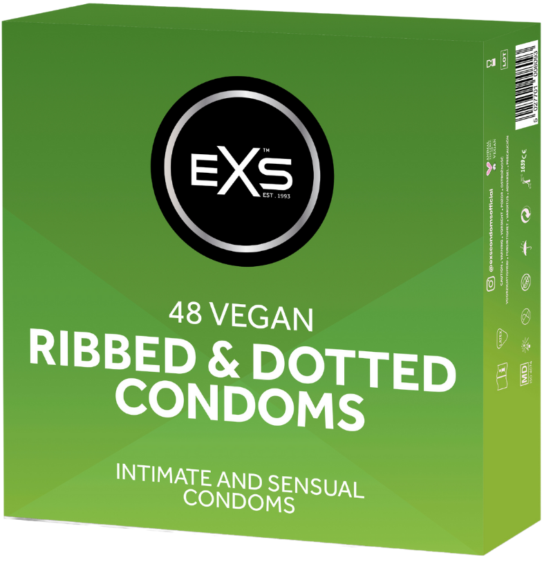 EXS condooms zijn vegan, hebben geen latexgeur en bieden een natuurlijk veilig gevoel. Geproduceerd naar internationale standaarden, elektronisch getest en alle producten dragen naast het bekende CE merk ook het Britse Kitemark.