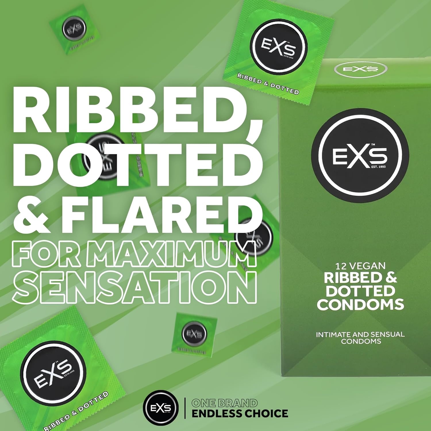 EXS Ribbed Dotted & Flared condooms met ribbels, nopjes en een gevormde 62mm top voor extra comfort, veiligheid en stimulatie.