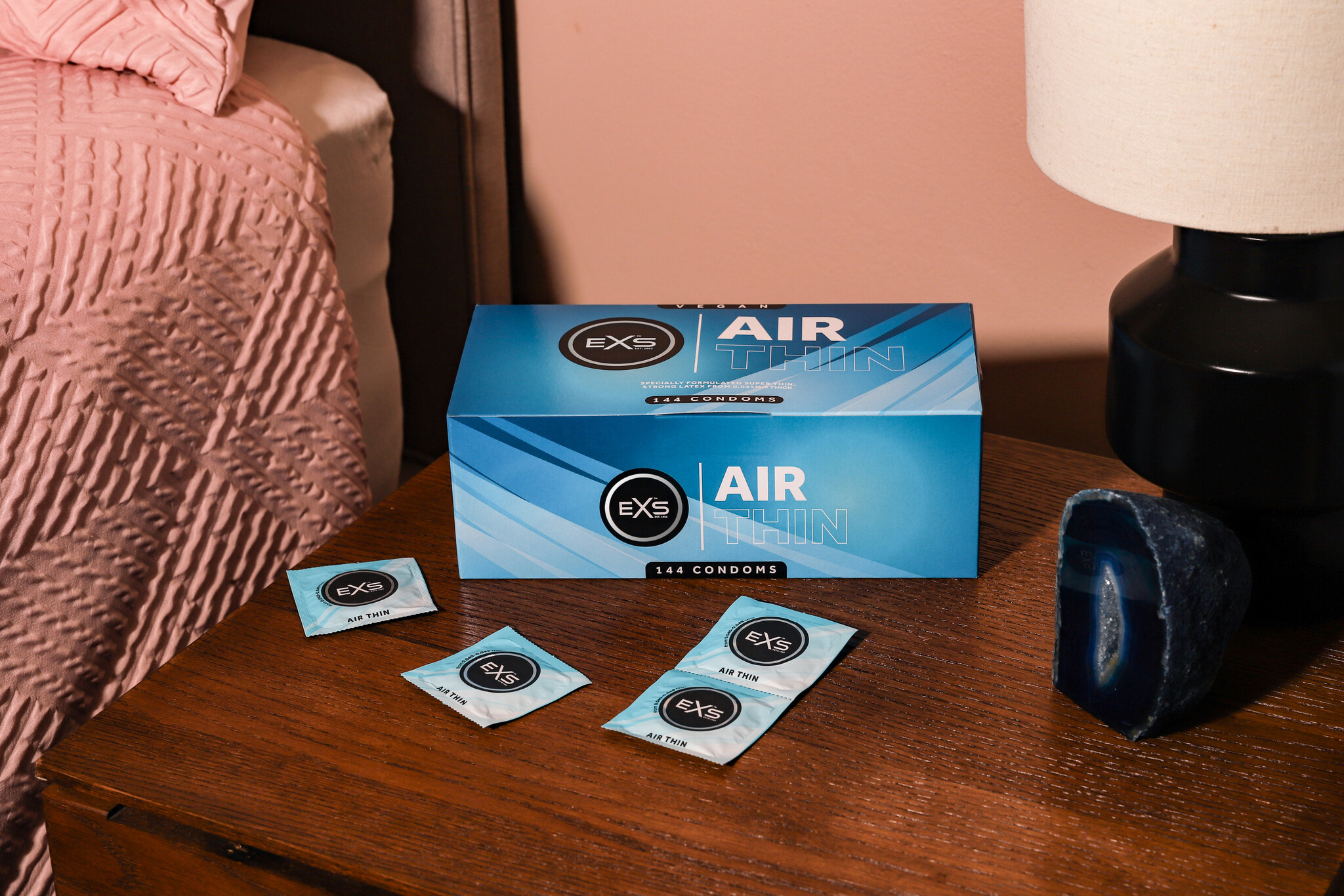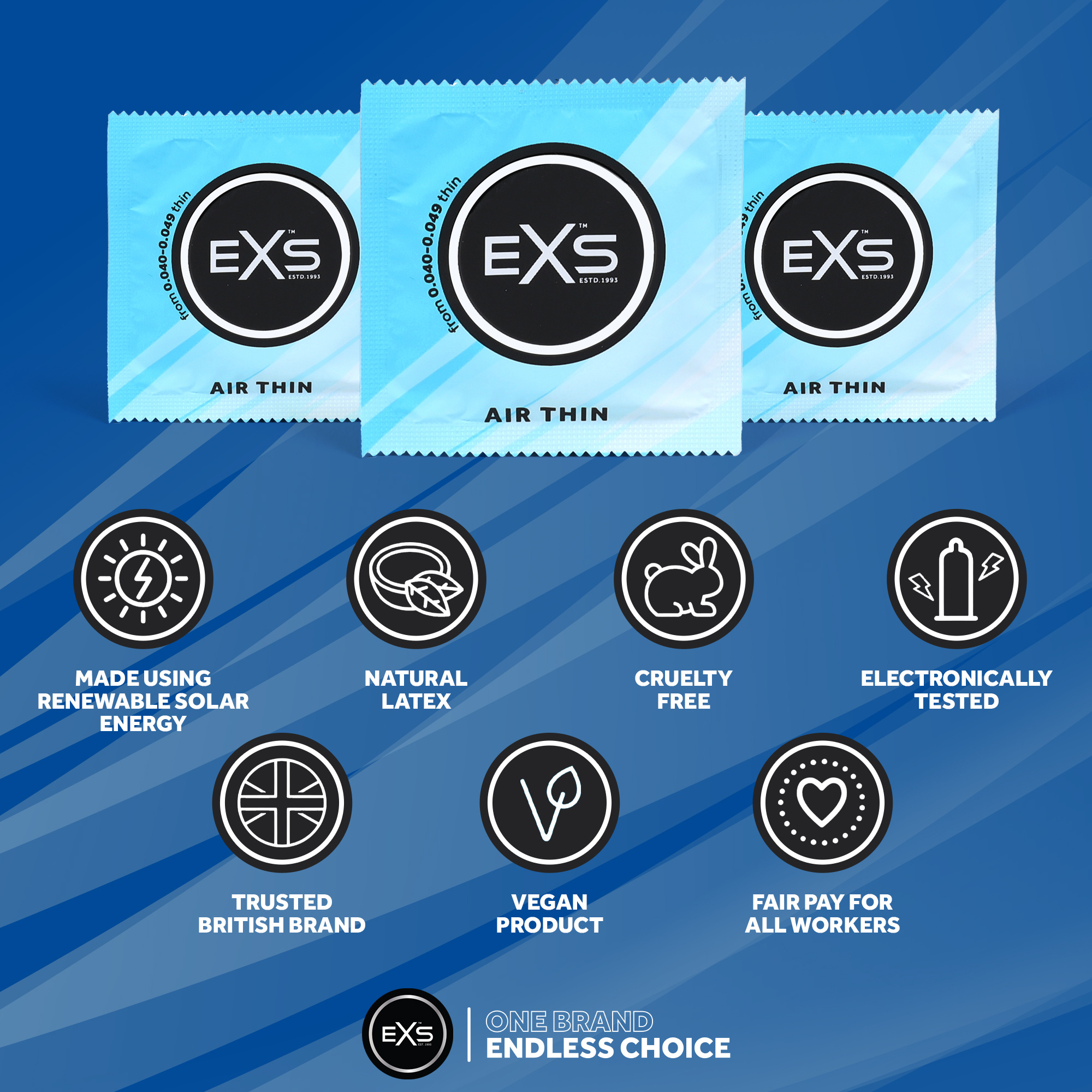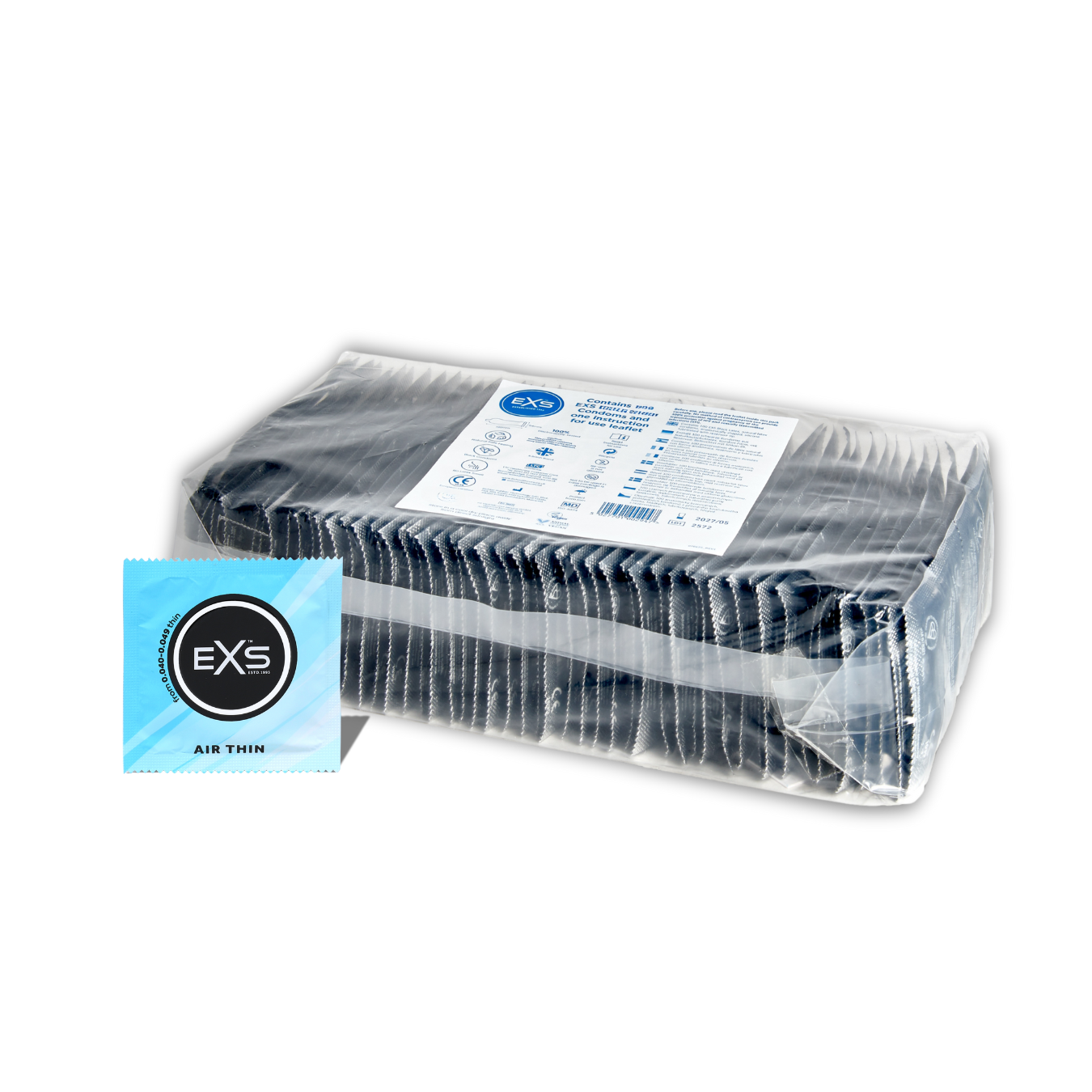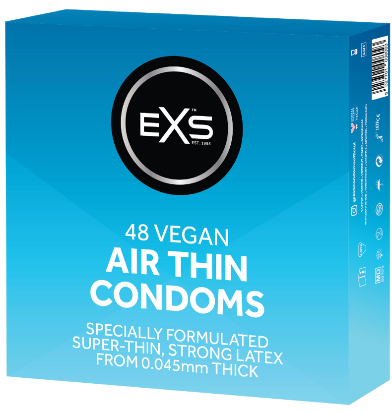 EXS Air Thin condooms zijn vervaardigd uit natuurlijk rubber latex, hebben een reservoir en een niet zaaddodend glijmiddel op siliconenbasis. Het condoom is anatomisch gevormd: het heeft een nominale breedte van 56mm en een ruimere top van 65mm.