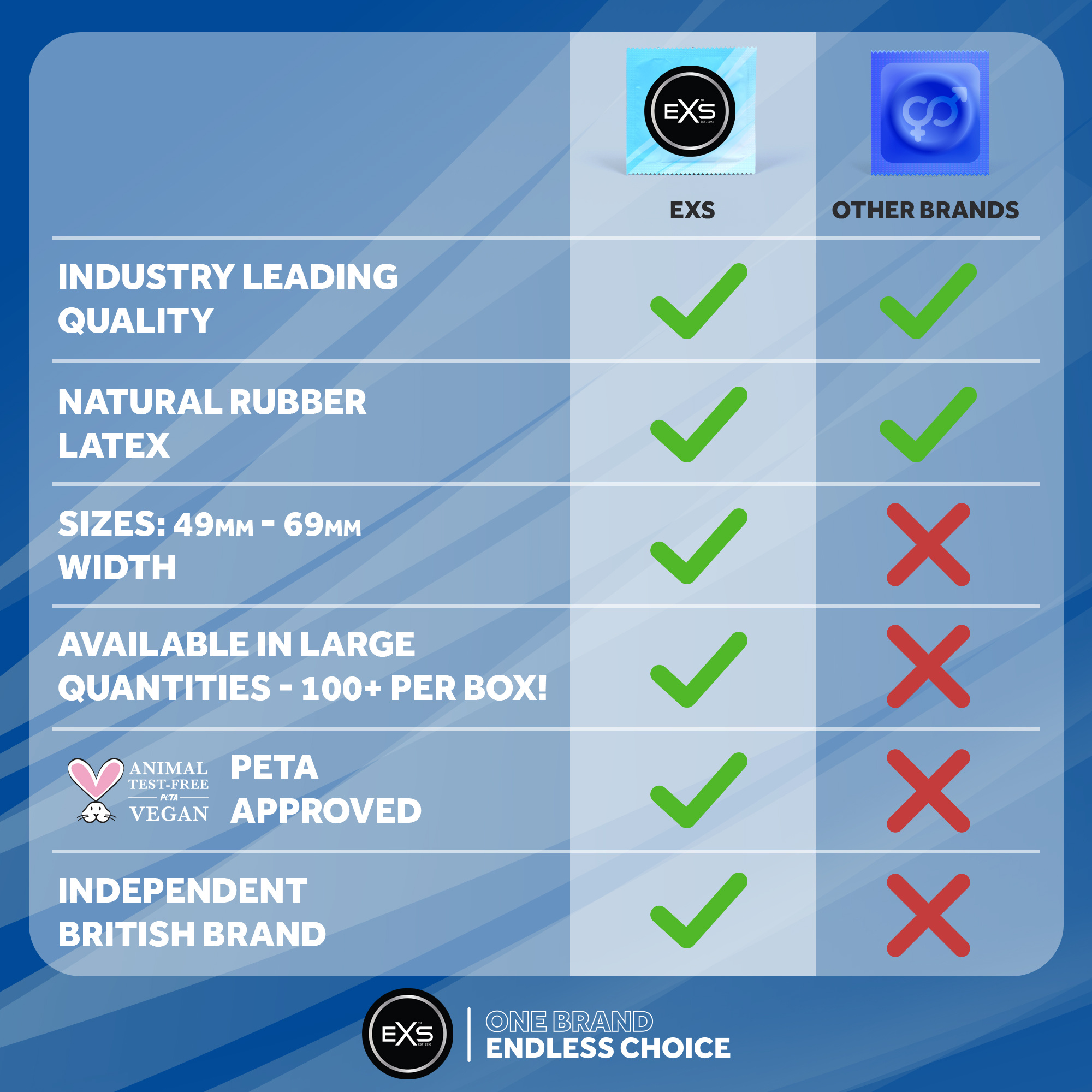 EXS condooms hebben geen latexgeur en bieden een natuurlijk veilig gevoel. Geproduceerd naar internationale standaards, elektronisch getest en alle producten dragen naast het bekende CE merk ook het Britse Kitemark.