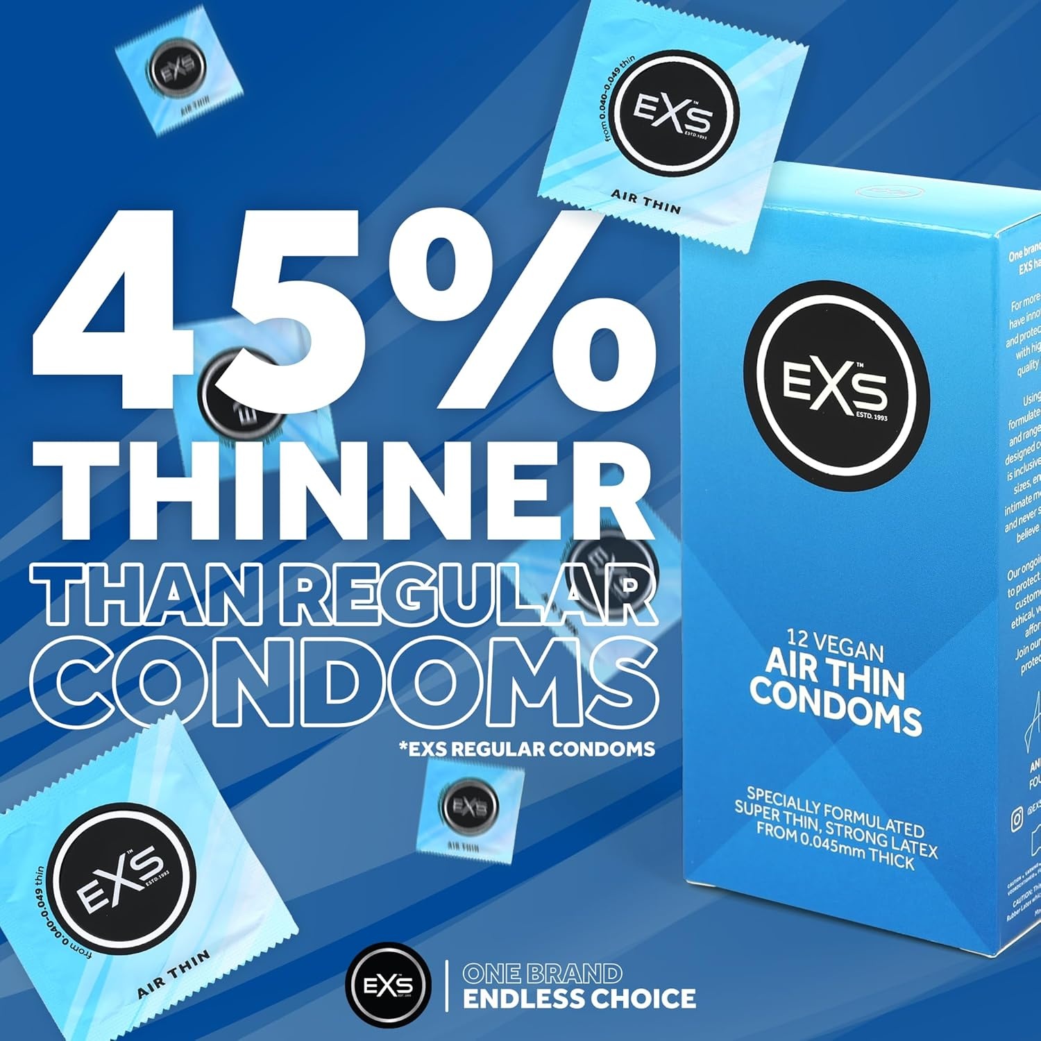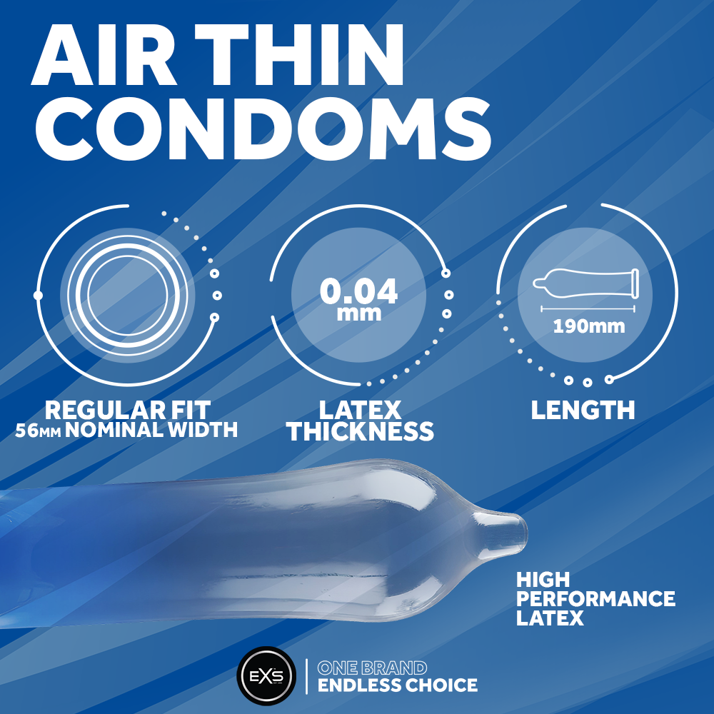 EXS Air Thin condooms zijn veel dunner dan reguliere condooms voor extra gevoel. De dikte is namelijk +/- 0,045 mm, waar de overige EXS condooms +/- 0,075 mm dik zijn.