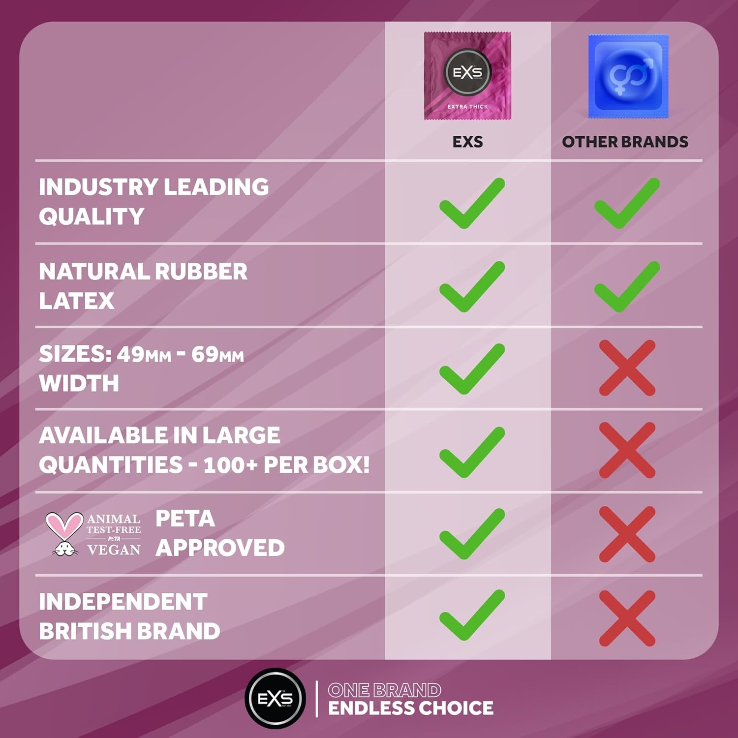 EXS condooms zijn vegan, hebben geen latexgeur en bieden een natuurlijk veilig gevoel. Geproduceerd naar internationale standaards, elektronisch getest en alle producten dragen naast het bekende CE merk ook het Britse Kitemark.