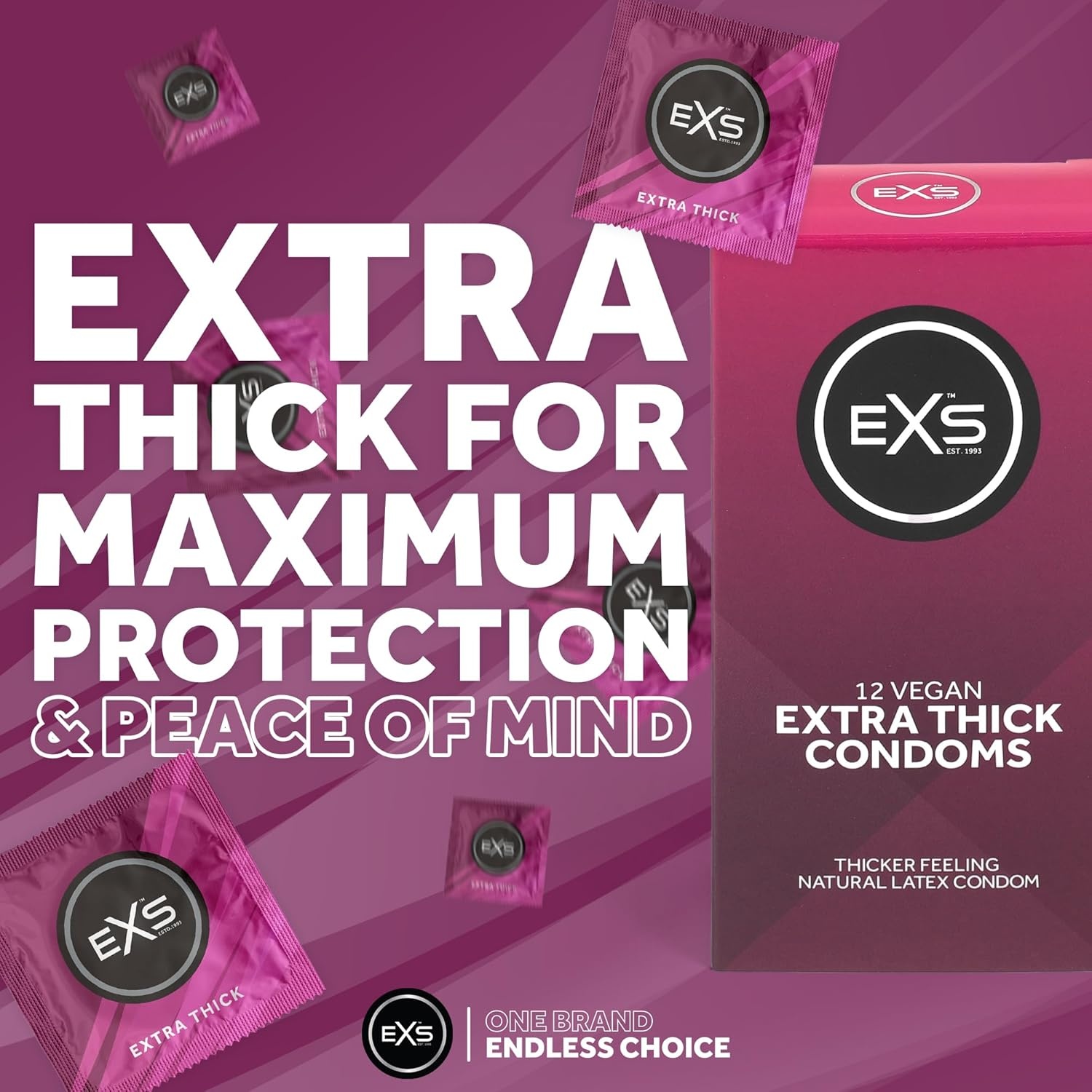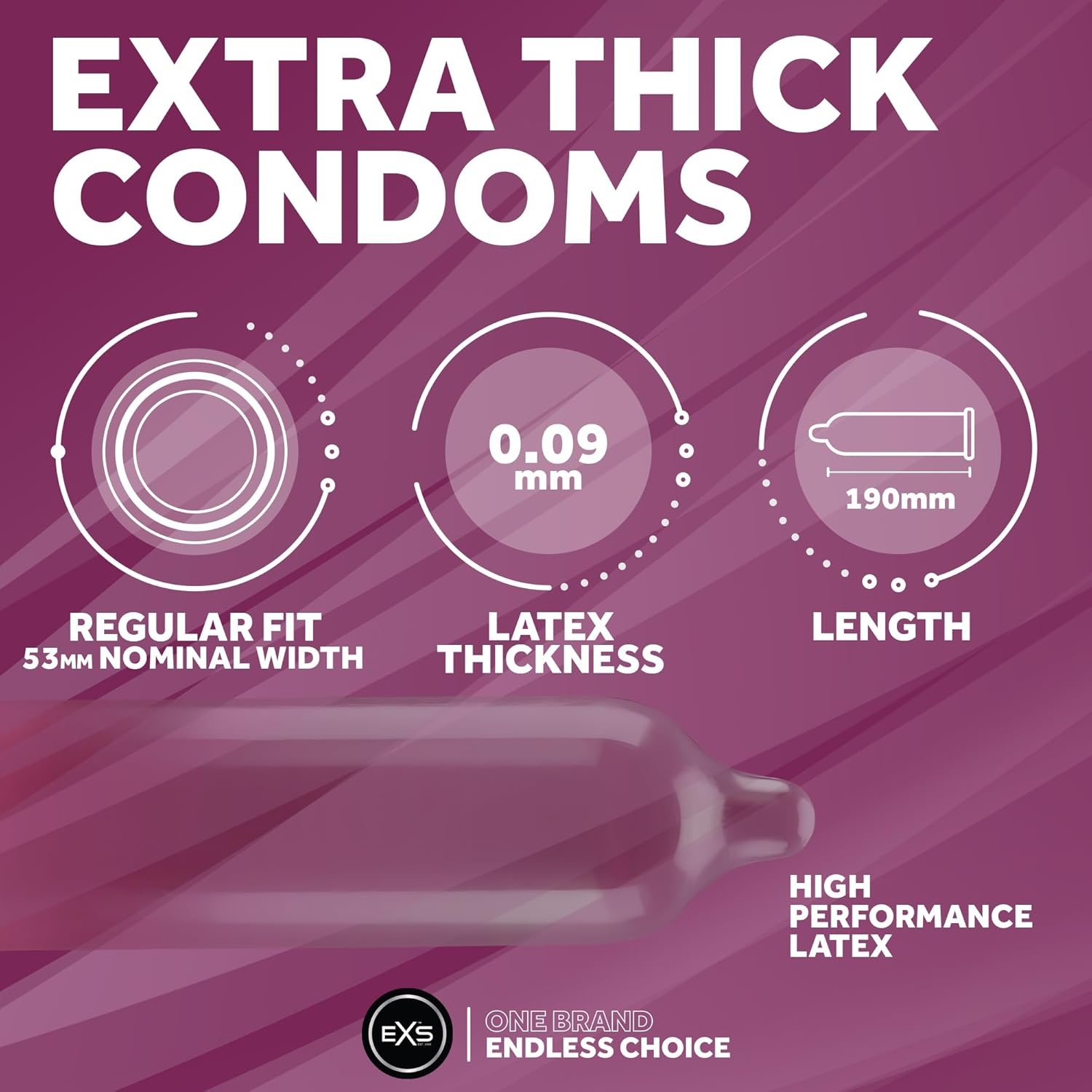 EXS Extra Thick condooms zijn extra sterke latex condooms van 80 micron dik, voorzien van glijmiddel en reservoir.