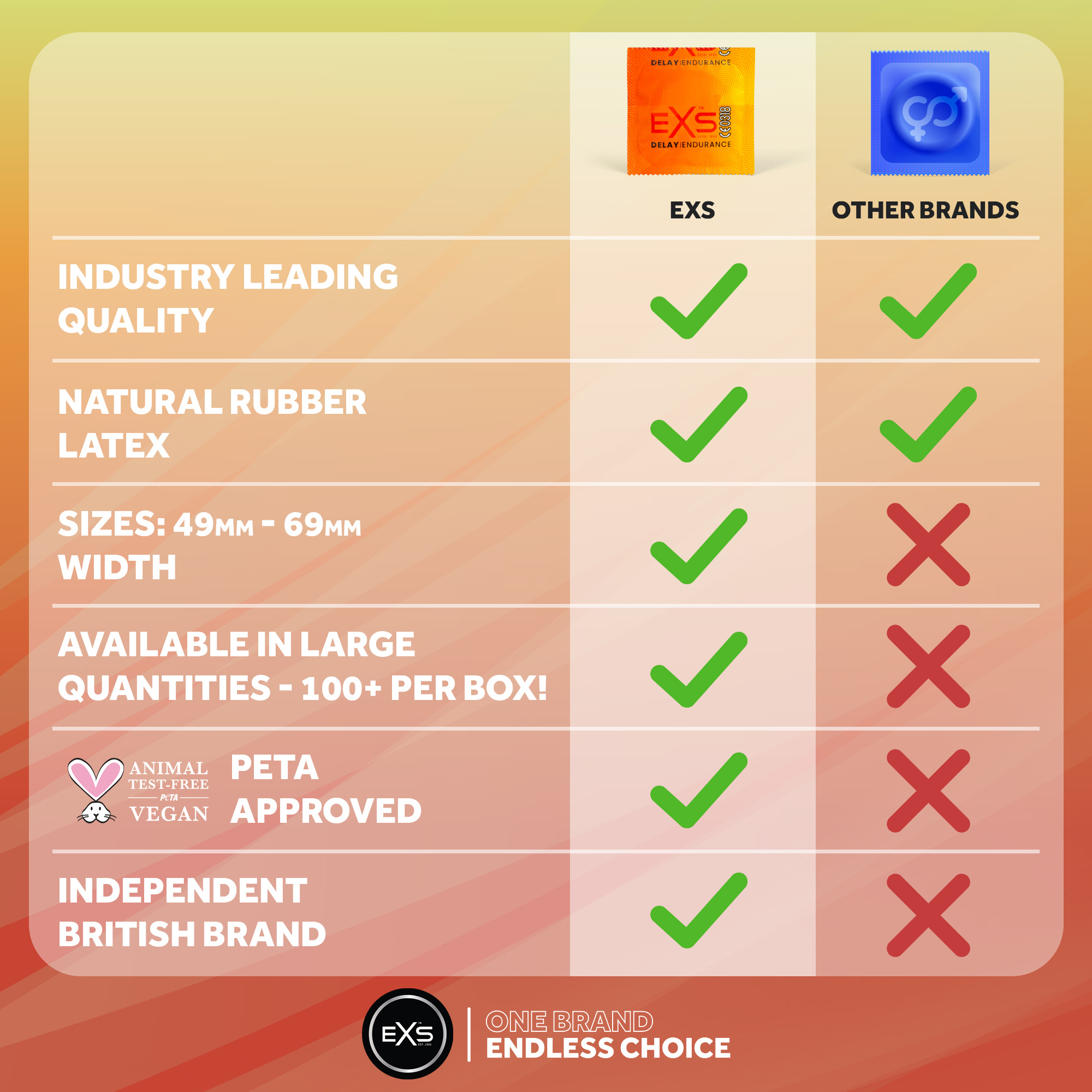 EXS condooms hebben geen latexgeur en bieden een natuurlijk veilig gevoel. Geproduceerd naar internationale standaards, elektronisch getest en alle producten dragen naast het bekende CE merk ook het Britse Kitemark.