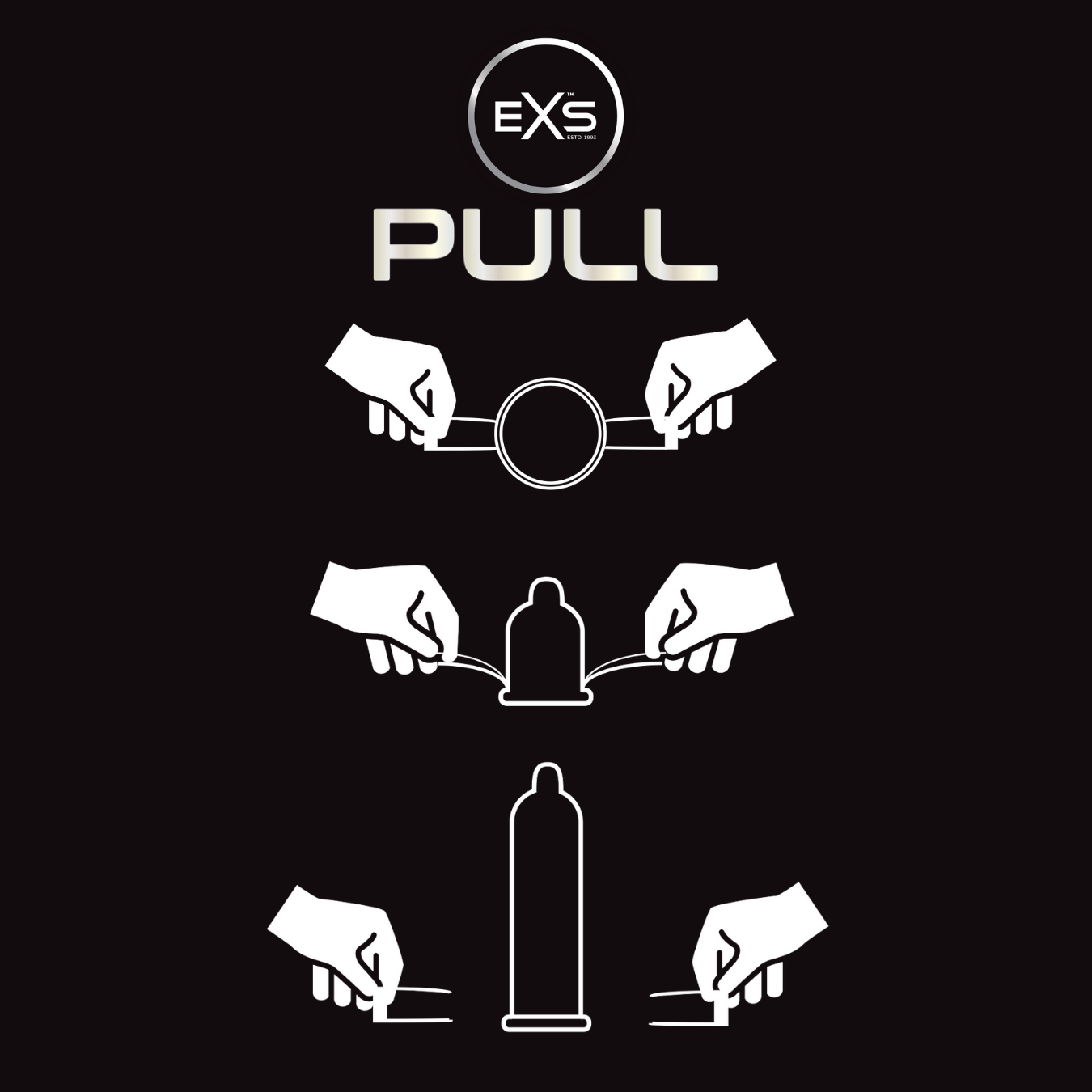 De EXS Pull condooms zijn veilig verpakt in een 3 stuks 'creditcard-cassette', bij de 6 stuks en 72 stuks verpakking zit elk condoom in een kunststof cupje afgedekt met een folie. Nadat je een EXS Pull condoom uit de verpakking neemt, pak je de stripjes aan beide zijden vast, plaats je het op de top van de penis en rol je het condoom af door de stripjes richting het lichaam te trekken (zie filmpje onderaan de pagina).