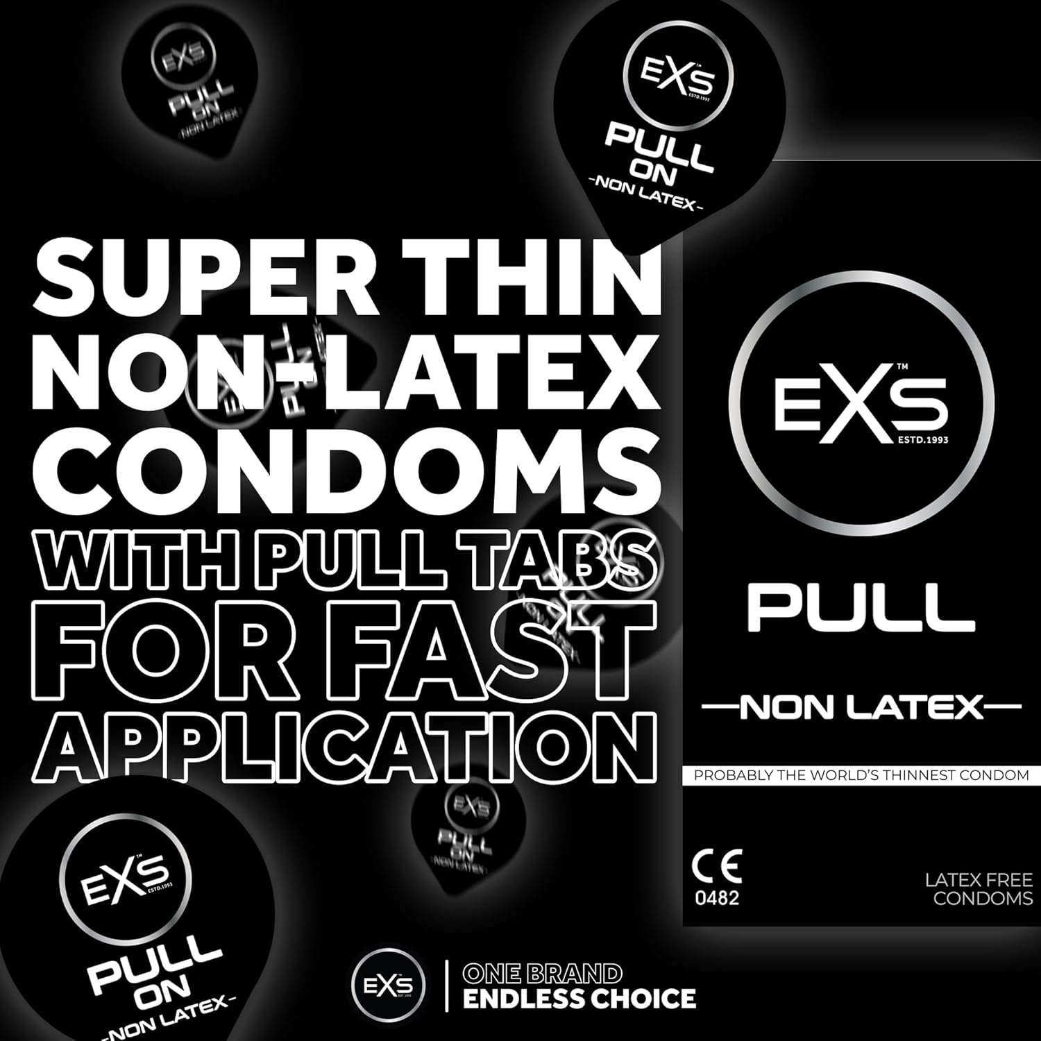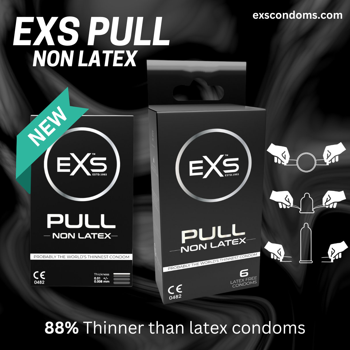 EXS Pull condooms zijn extreem dunne, maar toch sterke condooms die zijn gemaakt van non-latex A10 Resin (letterlijk vertaald: een kunststof hars). Omdat deze condooms slechts 8 tot 10 micron (0.008-0,01 mm) dun zijn en het materiaal lichaamswarmte beter geleidt, kunnen beide partners een intiemer gevoel ervaren.