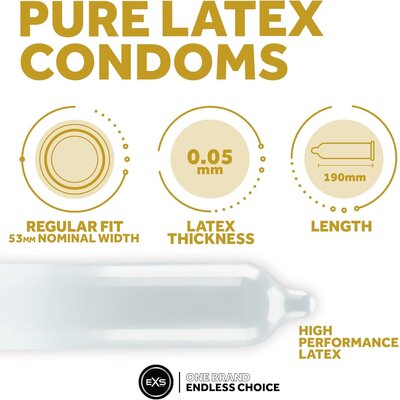 EXS Pure Ultra Thin Latex Condoms hebben een nominale breedte van 53mm. EXS Pure condooms zijn net als de EXS Air Thin condooms en de EXS Nano Thin condooms veel dunner dan reguliere condooms voor extra gevoel. De dikte is namelijk +/- 0,045 mm, waar de overige EXS condooms +/- 0,075 mm dik zijn.