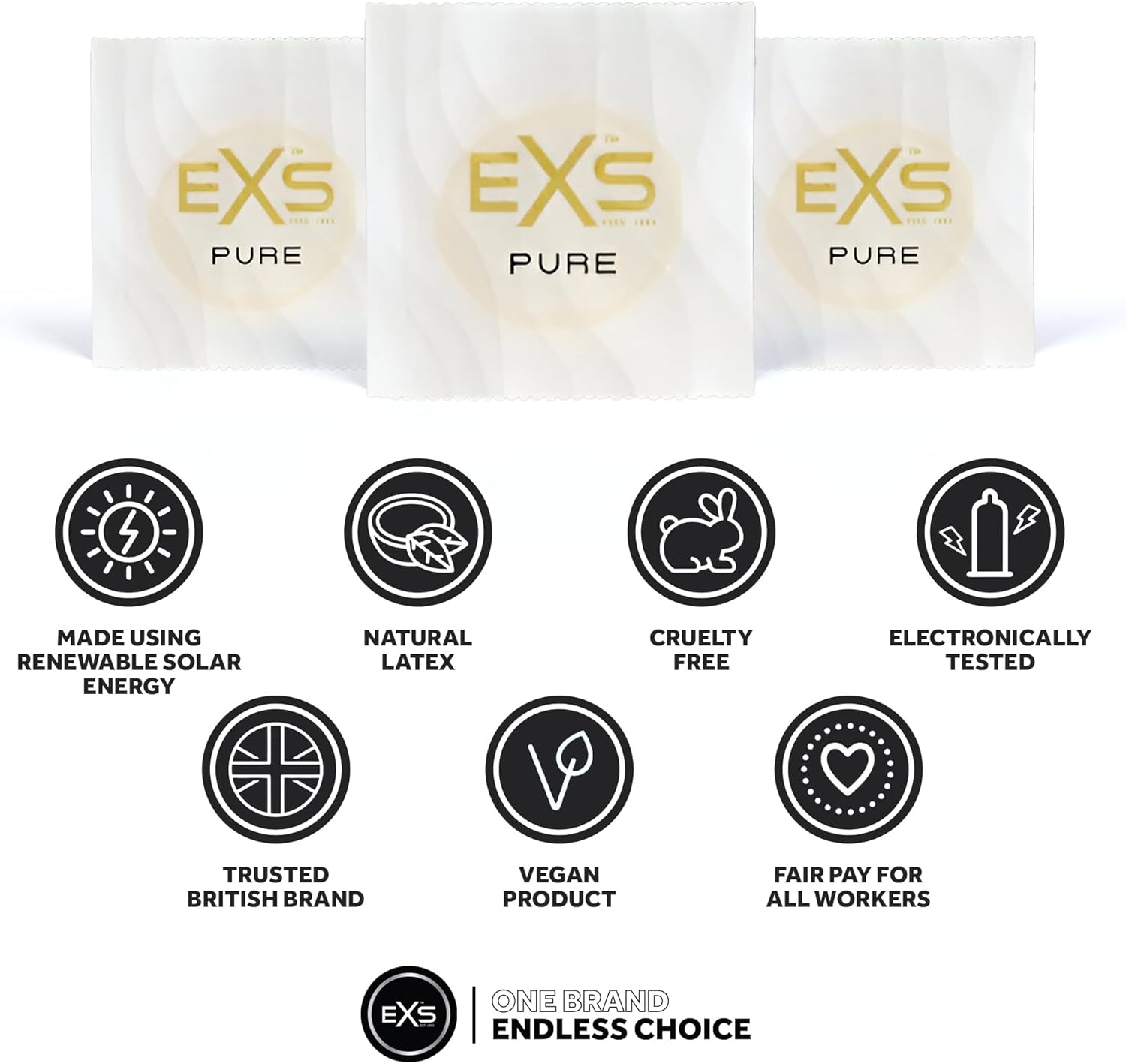 EXS Pure condooms zijn geïnspireerd door eerlijkheid, gelijkheid en duurzaamheid tijdens elke stap van het productieproces en de toeleveringsketen. Meer dan 50% van de energie voor de productie van deze condooms is afkomstig van zonne-energie.