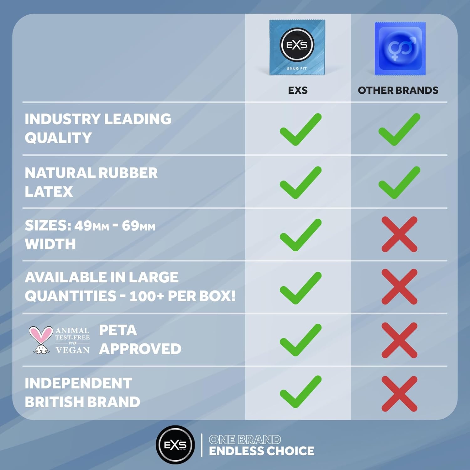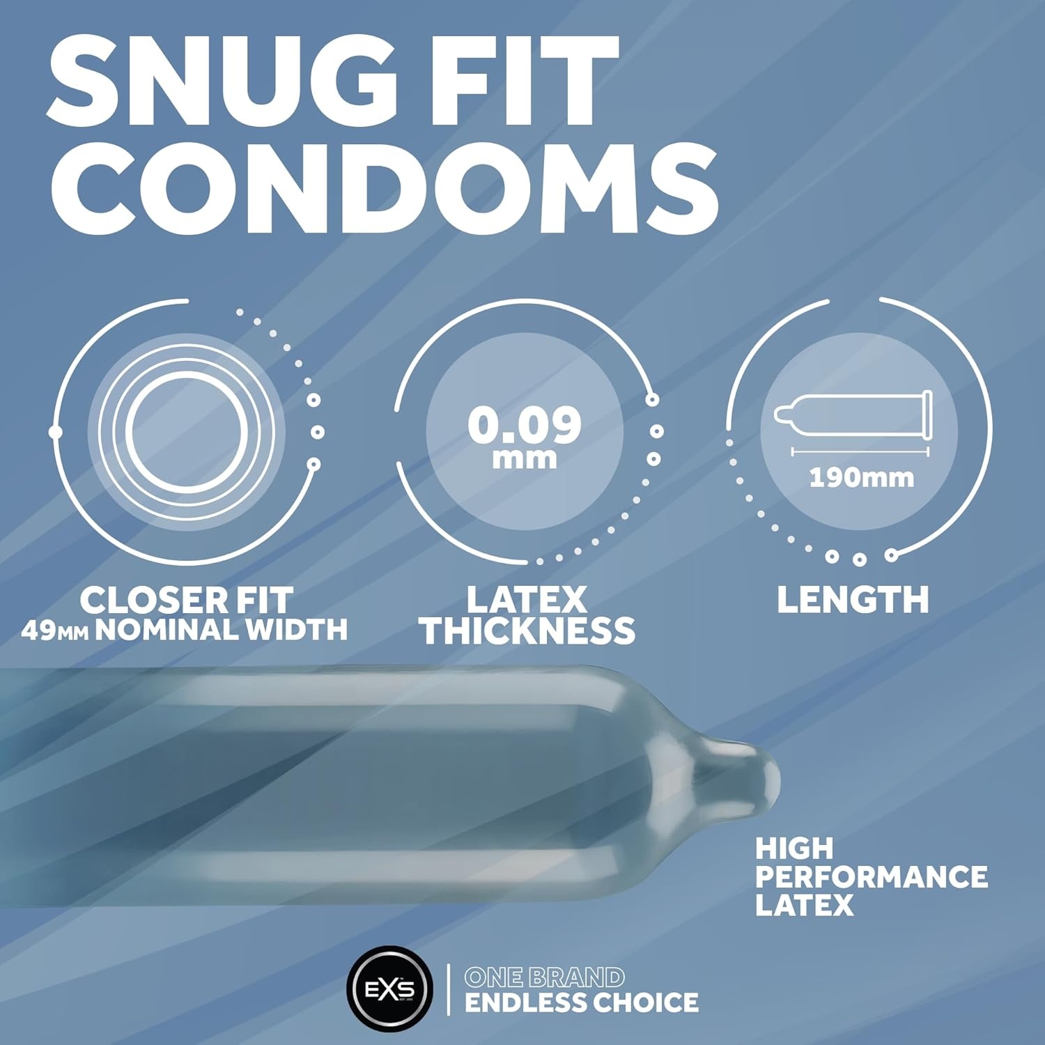 EXS Snug Fit-condooms hebben met een nominale breedte van 49mm een net iets strakkere pasvorm voor mannen die gewone condooms te losjes vinden zitten tijdens het liefdesspel. De pasvorm van dit condoom is 3mm strakker dan gewone condooms. Deze condoommaat wordt geadviseerd bij een penisomtrek tot 11cm.