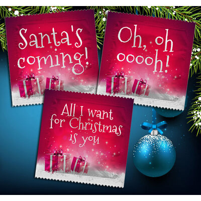 Verras je partner (of wie je maar wilt) in de feestelijke decembermaand 3 keer met grappige condooms! Met deze set ontvang je 3 transparante doosjes met in elk doosje 3 condooms met verschillende bedrukking op de folie!