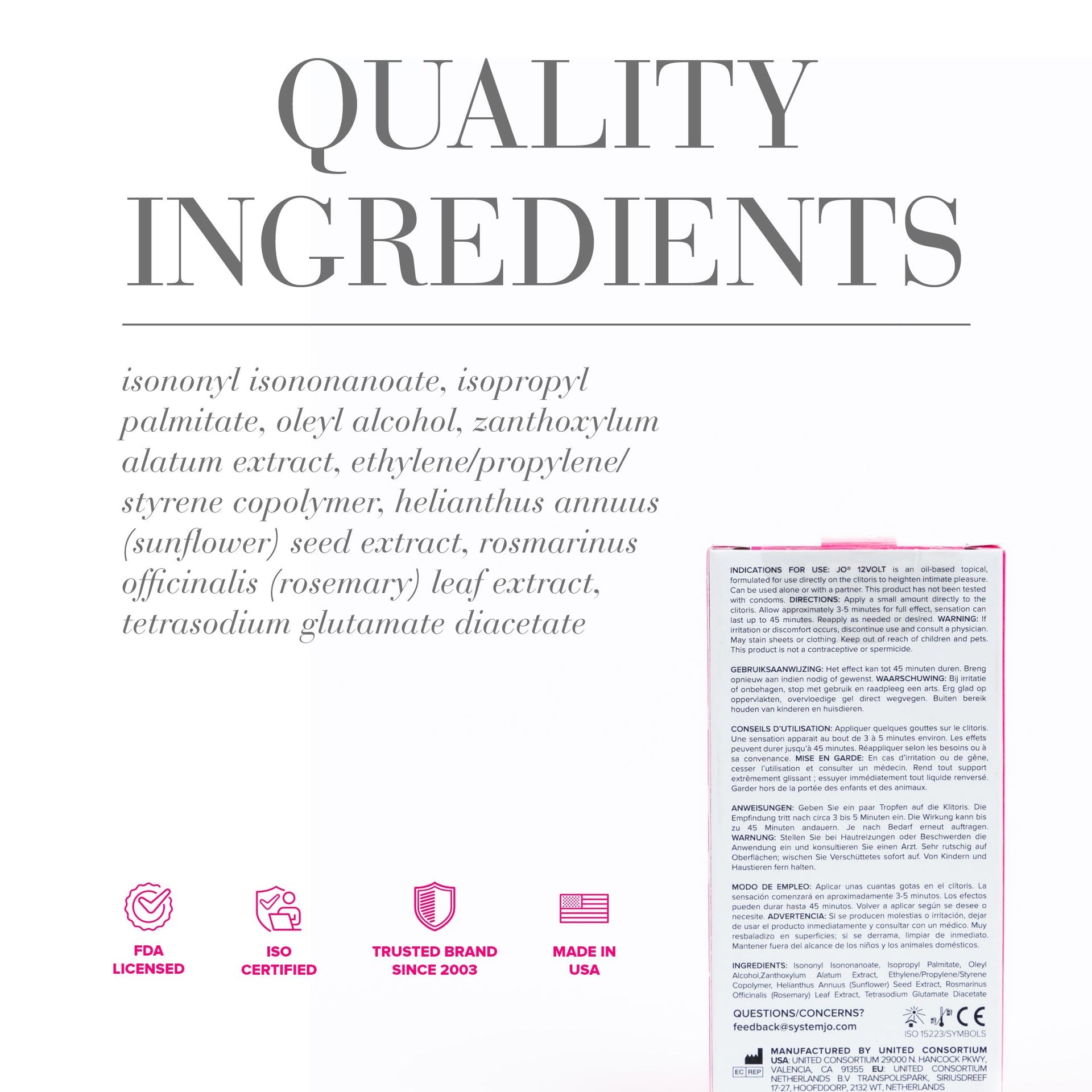 JO® VOLT is een topische formule op oliebasis, ontworpen om sensueel genot te stimuleren en te verhogen met een opwindende zoemende sensatie. Het lichte serum is samengesteld om het libido, de sensatie en de gevoeligheid van het aanraken tijdens het voor- en/of solo-spel te verhogen. Deze formule bevat geen conserveringsmiddelen en antioxidanten.