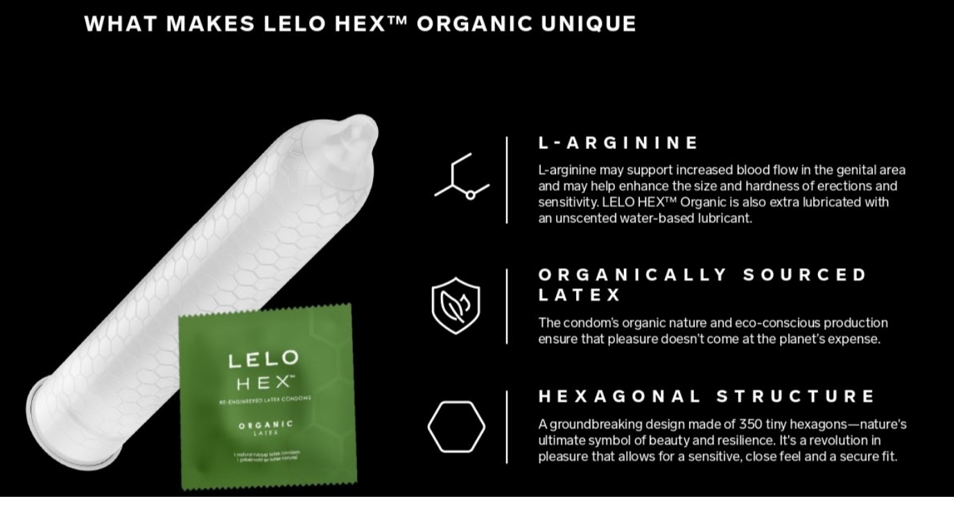 LELO HEX Organic condooms zijn unieke condooms omdat deze L-arginine bevatten, een natuurlijk aminozuur dat de bloeddoorstroming bevordert en kan daardoor zorgen voor een stevigere, langdurigere erectie voor een meer gevoelige ervaring.