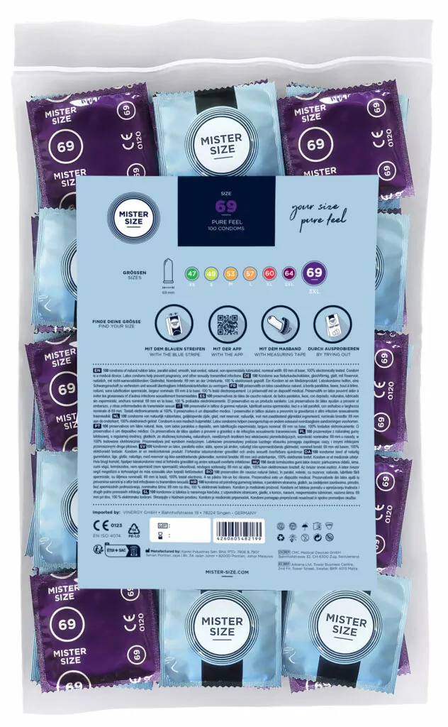 MISTER SIZE bezorgt je een heel nieuwe gevoel tijdens de seks terwijl het tegelijkertijd optimale bescherming biedt. Alle MISTER SIZE condooms voldoen aan de DIN standaard EN ISO 4074:2002 en zijn zorgvuldig getest. Een condoom met optimale veiligheid schept vertrouwen en biedt jullie beiden de mogelijkheid volledig te ontspannen en te genieten van jullie liefdesspel. Let op: er zijn verpakkingen met de tekst EXTRA FINE en nieuwere verpakkingen met de tekst PURE FEEL. De condooms in deze verpakkingen zijn identiek. Bij de productie van Mister Size condooms worden geen dierlijke componenten gebruikt, ze zijn dus vegan.
