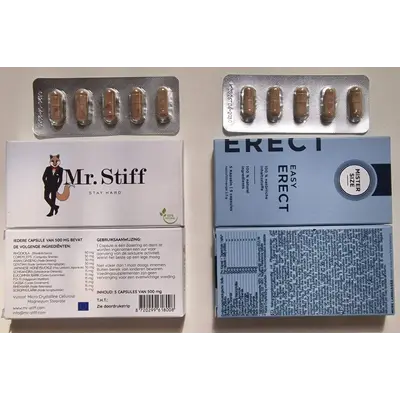 Tijdelijk ontvang je deze capsules in de internationale Easy Erect verpakking, wegens vertraging in de levering van Mr. Stiff doosjes. Ander doosje, exact dezelfde capsules.
