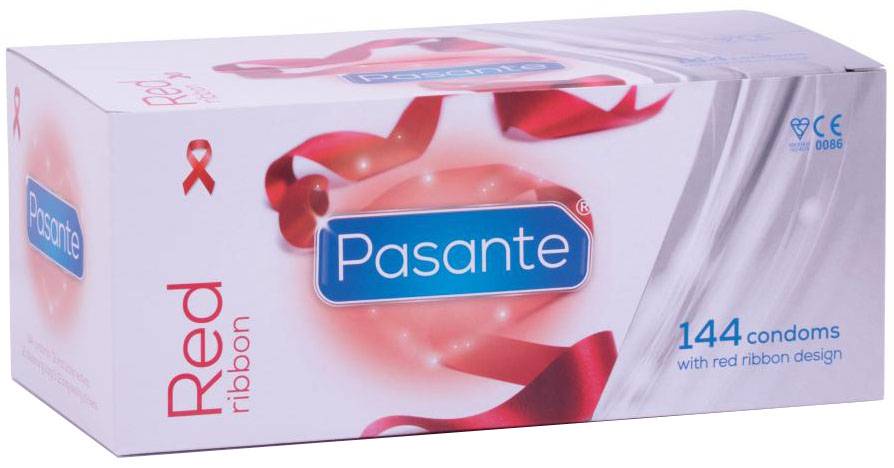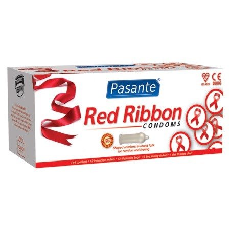 Pasante Red Ribbon condooms zijn verpakt in een opvallende folie met daarop het bekende Red Ribbon logo.