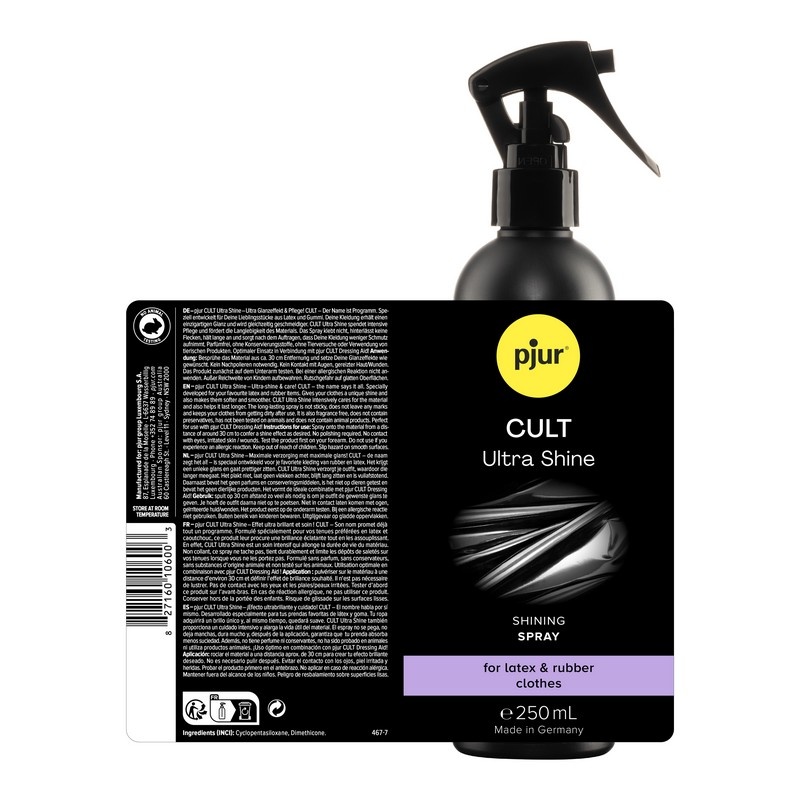 pjur® Cult Ultra Shine is een shinig spray voor de intensieve verzorging van rubber en latex. Deze nieuwe schitterende spray is speciaal voor liefhebbers van rubber, latex en leren kleding. Naast de klassieke aankleedhulp Pjur Cult is er nu dus ook een verbeterd product voor deze fetish. Pjur Cult Ultra Shine spray geeft een spiegelend effect op het bespoten gebied en geeft het materiaal een sensationeel en opwindend uiterlijk. Daarnaast geeft het een diepe verzorging aan rubber, latex en leer waardoor het zacht en soepel wordt, wat de duurzaamheid uitbreidt en de gladheid vergroot. De unieke formule is nooit plakkerig, vlekbestendig en duurzaam.