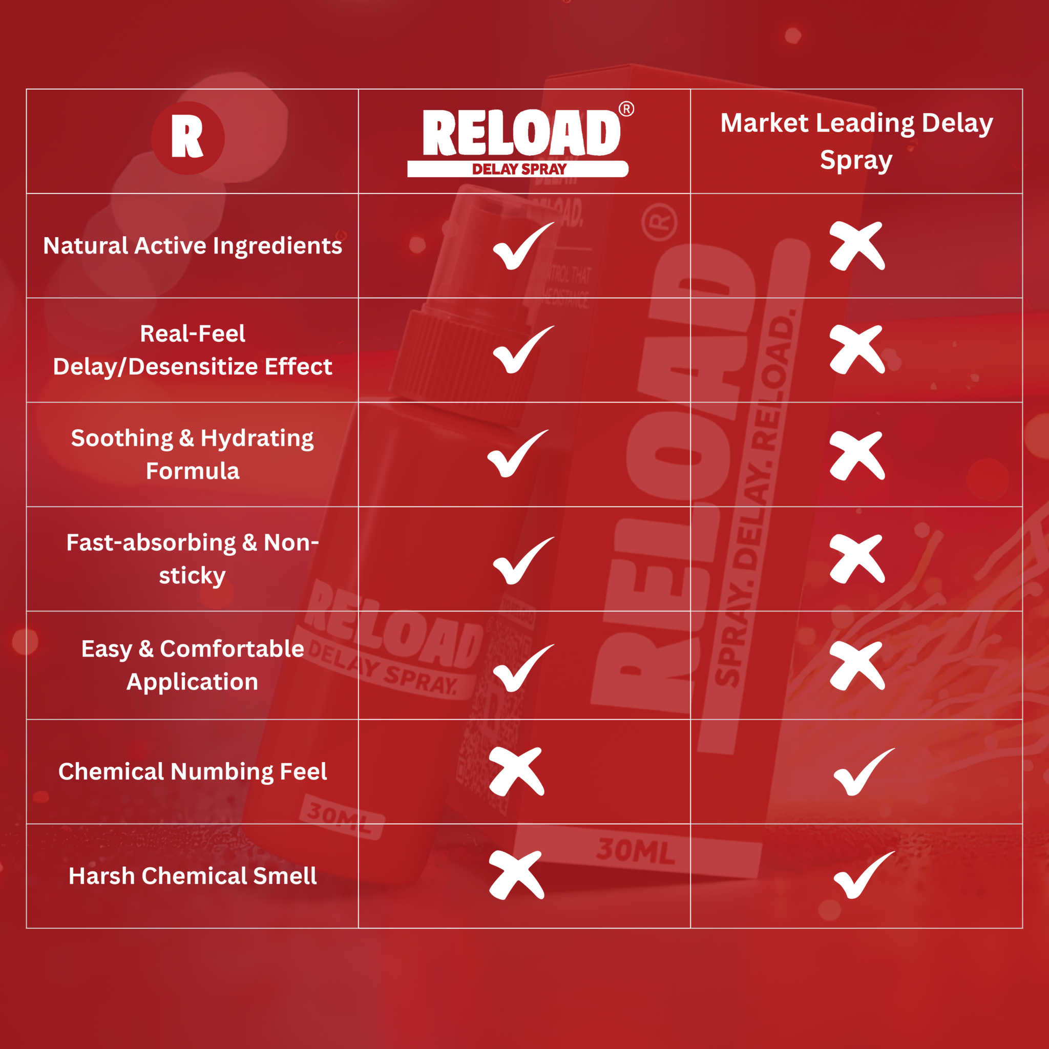 Ontworpen voor mannen die zich zelfverzekerd willen voelen, controle willen hebben en optimaal willen presteren. RELOAD Delay Spray helpt het orgasme uit te stellen dankzij actieve bestanddelen zoals gemberwortelolie, Spilanthes Acmella, Mentha Arvensis-bladolie en Aloë Barbadensis-bladsap. Daarmee zorgt het ervoor dat prestaties mogelijk worden met een natuurlijk desensibiliserend effect en een kalmerend, ontspannend comfort.