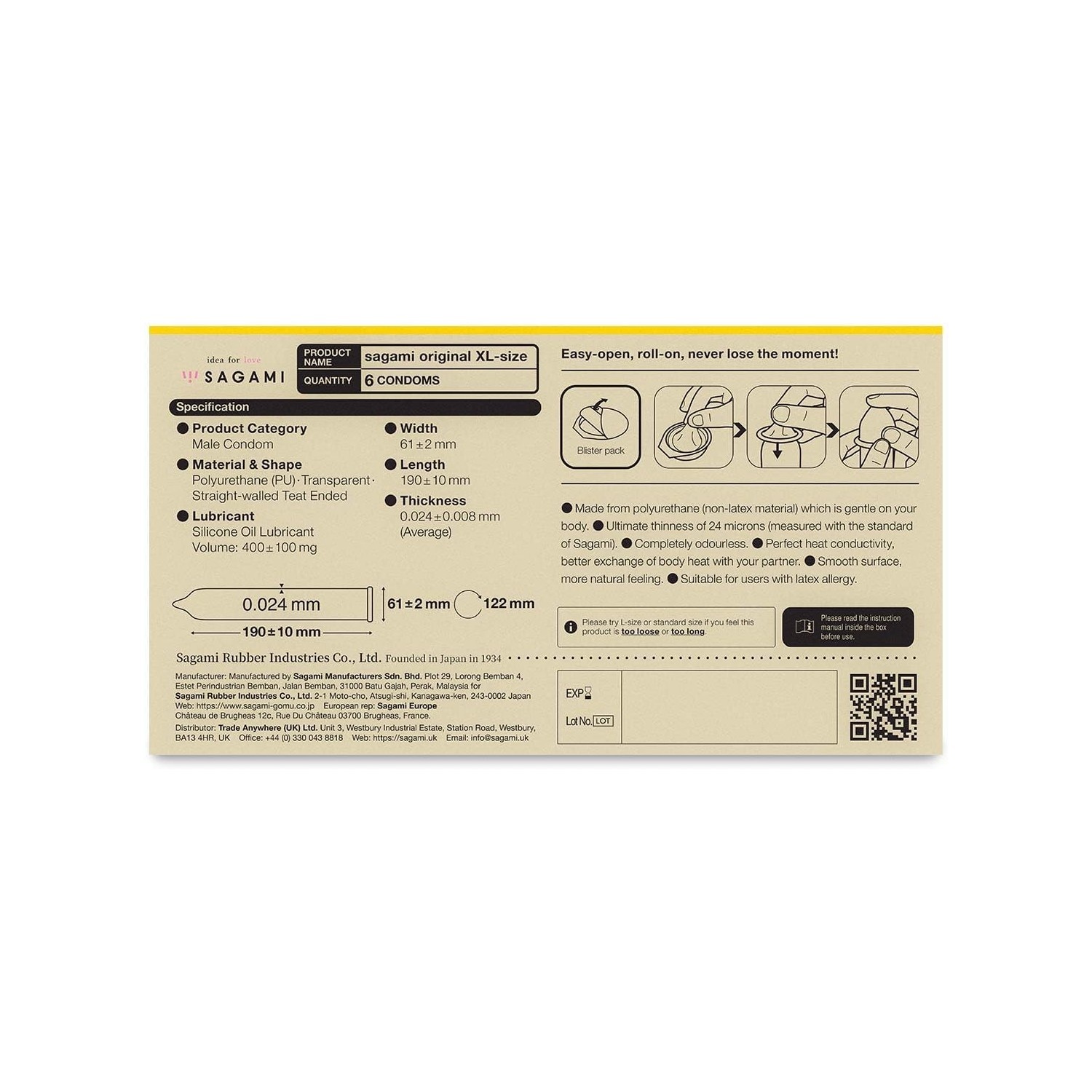 Sagami Original condooms zijn verkrijgbaar in verpakkingen van 6 of 12 stuks.