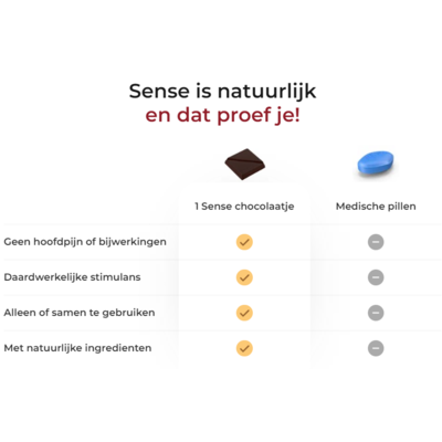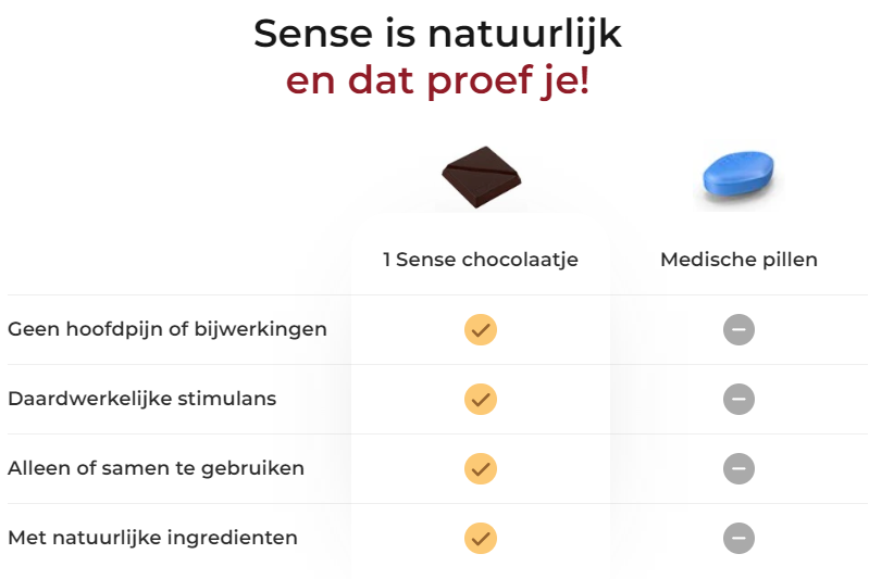 Sense Chocolate bevat de perfecte hoeveelheid epimedium, ginseng extract, fenylethylamine en L-arganine voor optimaal effect. Daarom wordt het ook wel Sex Chocolade genoemd! Lees hier uitgebreidere informatie over Sense Chocolate.