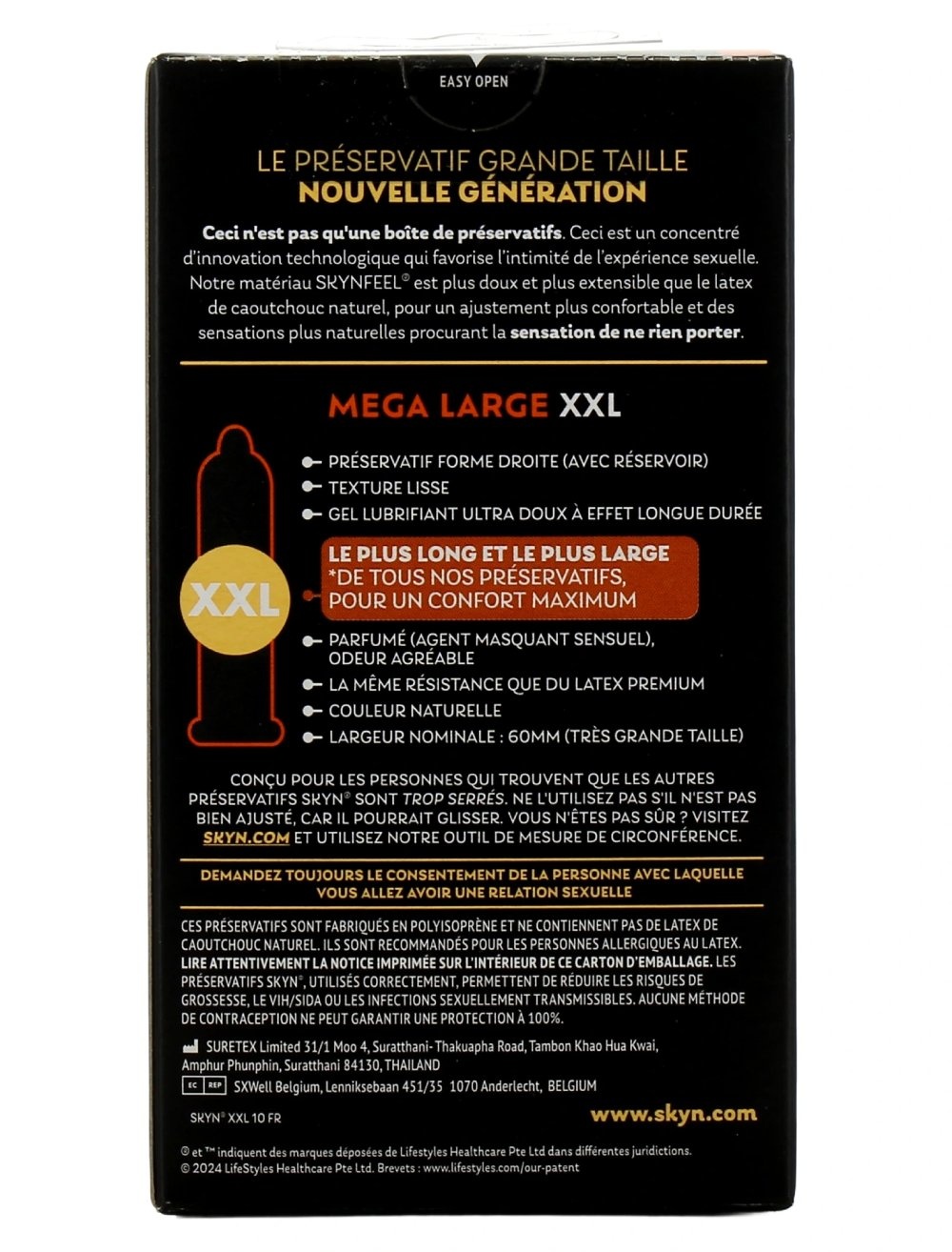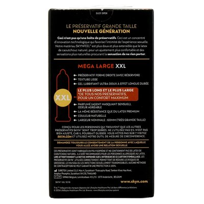 Skyn Mega Large XXL condooms zijn latexvrije condooms met een nominale breedte van 60mm, vervaardigd met Skyns Sensoprene Technology met het innovatief materiaal Polyisopreen. 'Sensoprene' condooms zorgen voor een zachter en natuurlijker gevoel. De condooms bevatten geen rubber latex en zijn daarom een uitstekende keuze voor mensen die overgevoelig zijn voor rubber latex of een latex-allergie hebben. De Skyn Mega Large XXL condooms zijn nog iets ruimer dan de Skyn King Size condooms (56mm nominale breedte).