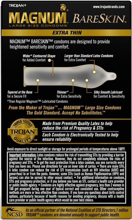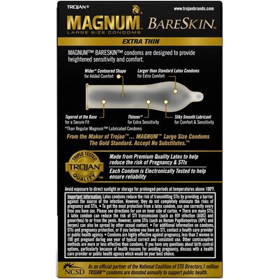 TROJAN MAGNUM BarseSkin condooms zijn de dunste condooms van Trojan, en met een nominale breedte van 57mm ook wat breder dan de 'gewone' Trojan Bareskin condooms.