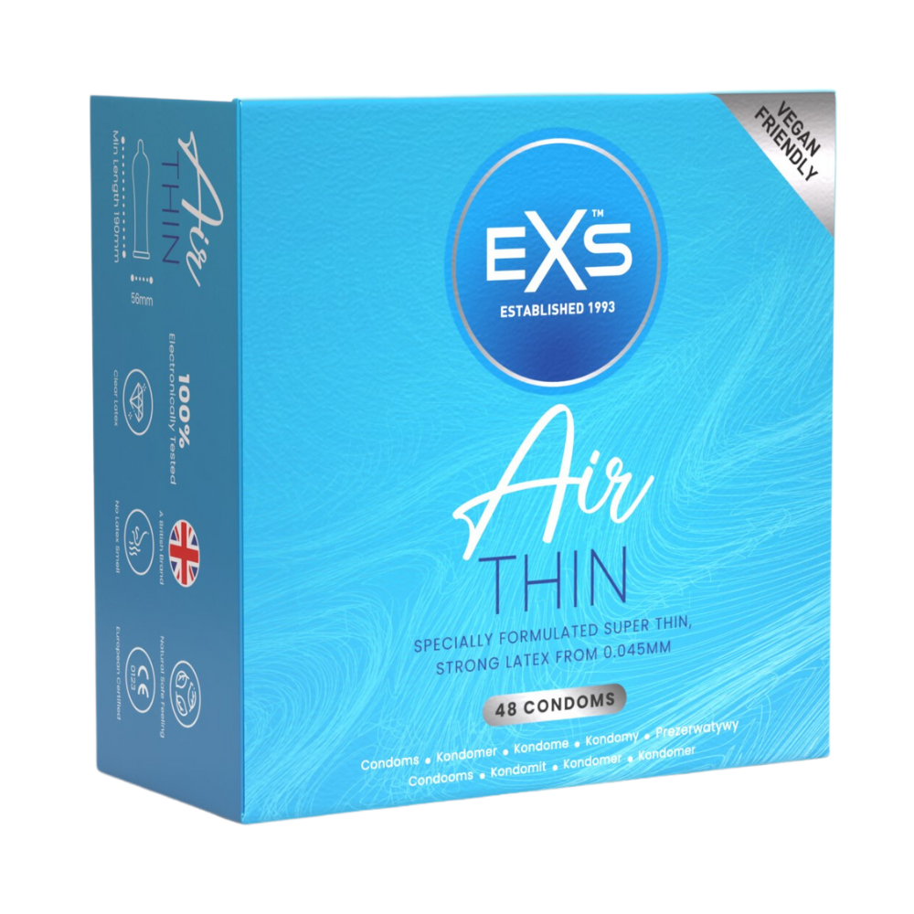 EXS Air Thin zijn net wat dunnere vegan condooms voor een optimaal gevoel. EXS condooms hebben geen latexgeur, zijn vervaardigd uit natuurlijk rubber latex, hebben een reservoir en een niet zaaddodend glijmiddel. Het condoom is anatomisch gevormd: het heeft een nominale breedte van 56mm en een ruimere top van 65mm.